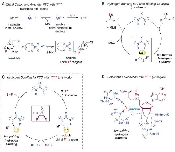 一般来说,由无机盐衍生出的阴离子亲核反应限于其不可溶性而不能用于对映选择性催化作用。如简单的氟化盐经过理论研究被认为可以非常简便地合成碳-氟键,然而在实际应用中氟化盐常常不能与其他反应物共溶于溶剂中,这极大地限制了氟盐在包括药物科学等领域的发展应用。