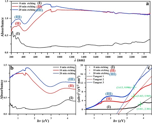 图2.紫外可见光谱:(a) 吸光度与入射光波长关系图, (b) 吸光度与能量之间关系图 (c) (αhv)2–hv图。