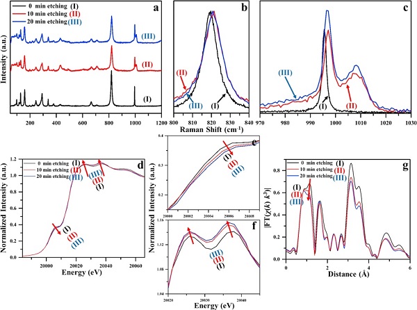 图3. 拉曼及X射线吸收精细结构图谱:(a) 三个样品的拉曼谱图,波数范围 50-1200 cm-1, (b-c)根据820cm-1处振动峰归一化后的拉曼图,波数范围800-840 cm-1 和 970-1030 cm-1, (d) 钼K吸收边的XANES 图谱以及 (g) 傅里叶变换的扩展X射线吸收精细结构谱(R空间)。