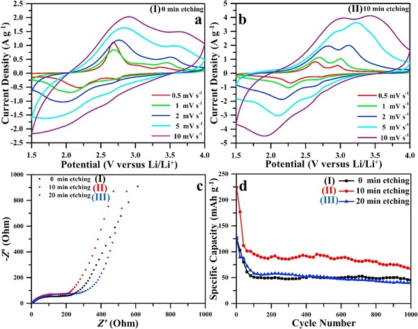 图5 电化学表征:(a-b)分别为MoO3(I)和MoO3(II)的循环伏安曲线,(c)三个样品的能斯特图和(d)1A g-1的循环性能。