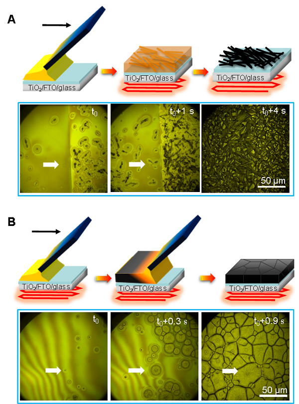 (B) 高温刮涂MAPbI3薄膜的示意图及薄膜的实时光学显微镜照片。