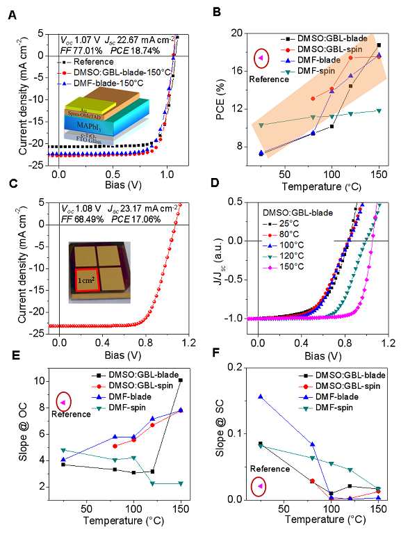 (A) 在DMSO:GBL-blade-25ºC with anti-solvent drip、 DMSO:GBL-blade-150℃和DMF-blade-150℃三种条件下器件的(J-V)曲线和电池结构示意图;