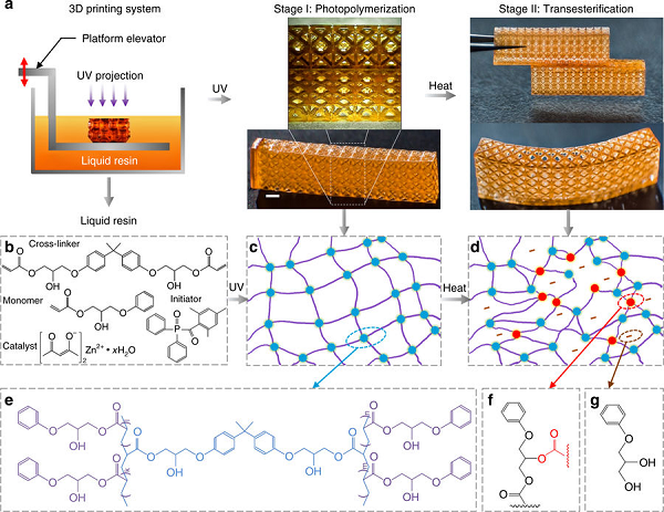 图2. 3D打印可再处理热固性光敏材料的再塑形性