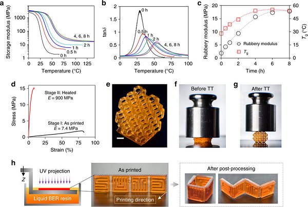 a-c)通过动态力学分析(Dynamic Mechanical Analysis-DMA)测试研究热处理对使用可再处理热固性光敏材料所打印样品的机械性能的影响。