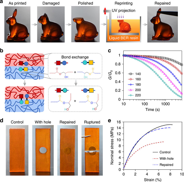 图3. 3D打印可再处理热固性光敏材料的再修复性