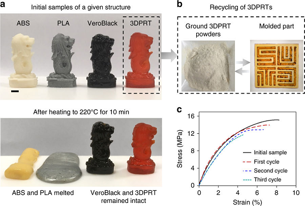 图4. 3D打印可再处理热固性光敏材料的再回收性