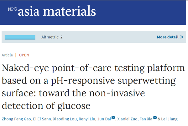 文献链接:Naked-eye point-of-care testing platform based on a pH-responsive superwetting surface: toward the non-invasive detection of glucose(NPG Asia Materials, 2018, DOI:10.1038/s41427-018-0024-7)
