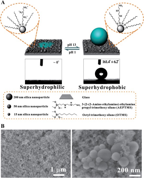 a.超疏水和超亲水性的pH响应超湿表面性质的转换工作原理。AEPTMS的百分比是10%的二氧化硅纳米颗粒,尺寸为15,50,和200纳米。CA的水滴在pH值下降到0°~ 1和增加到161.4°±6.2°pH值13;