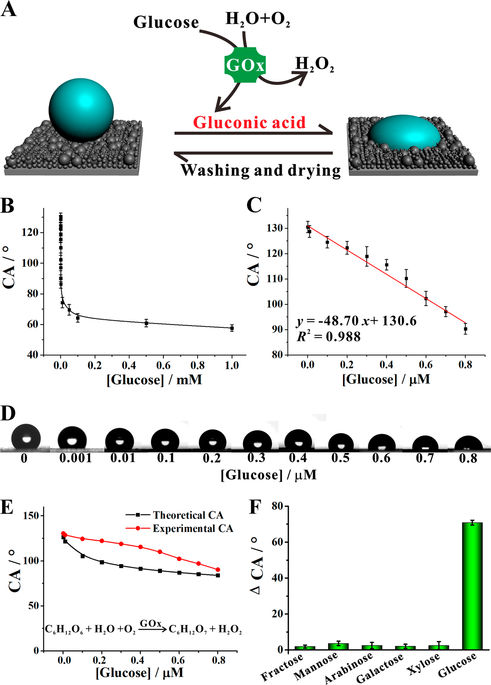 c . CA与葡萄糖浓度之间的线性关系,从1 nM到800 nM。d .在线性范围内不同浓度的葡萄糖滴润湿状态;