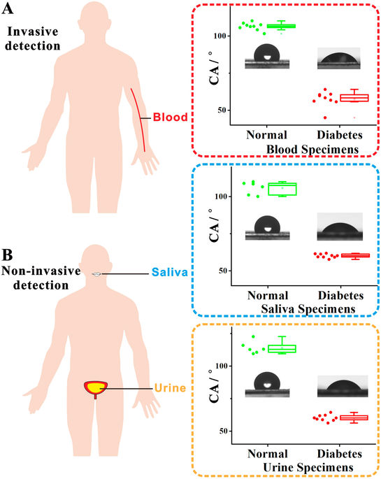 a侵入式葡萄糖检测糖尿病患者血液标本来自9和9正常人表明CAs正常样本的人超过100°,相应的疏水性,与患者diabeties下降到近50°,表明表面的亲水性;
