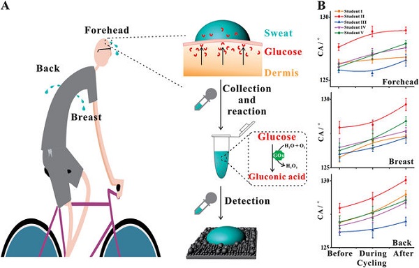 图6:在自行车运动前后的5名志愿者的前额、胸部和背部采集了一组用于无创血糖检测的汗液标本。
