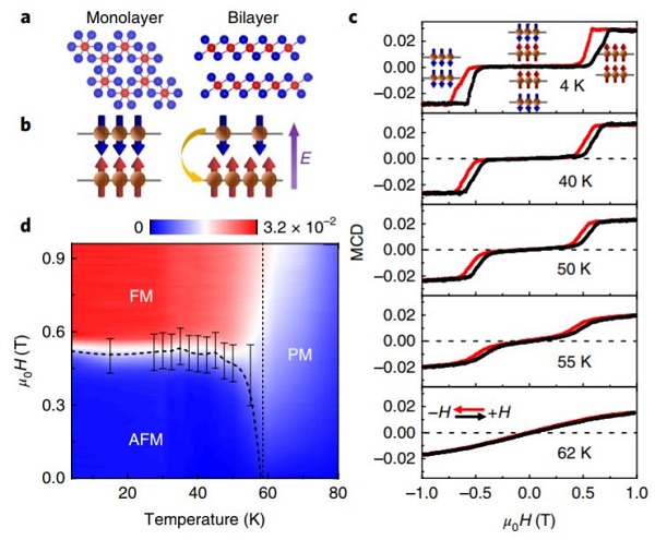 该团队在AFM双层CrI3中观察到大的线性ME效应,其使材料中的磁性的电控制成为可能。在AFM-FM自旋翻转相变附近,已经使用场效应器件证明了磁序的可逆电场切换。他们的研究结果证明了2D范德华磁体在电控非易失性存储器、自旋电子和电子器件应用的独特潜力。