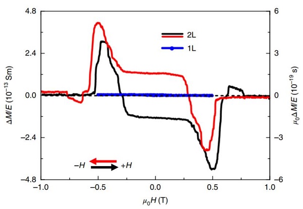 对于双层CrI3,通过在0.8V nm-1和0V nm-1下减去M-H曲线获得ME响应。然后通过电场差异对其进行归一化,黑色和红色实线分别是磁场的前向和后向扫描。对于CrI3单层,在0.34 V nm-1和-0.34 V nm-1下减去M-H曲线获得的。