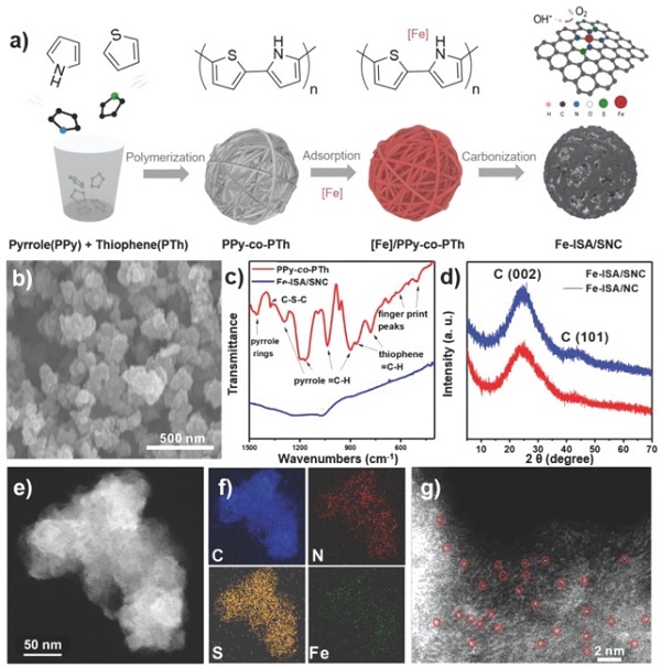 图1 a) Fe – ISA/SNC的合成过程的示意图。b) PPy-co-PTh 聚合物的SEM图像。c) PPy – co – PTh和Fe – ISA/SNC的红外光谱。d) Fe – ISA/SNC和Fe – ISA/NC的XRD谱。e) Fe – ISA/SNC的HAADF – STEM图像以及(f)对应的Fe(绿色)、C(蓝色)、N(红色)和S(橙色)元素分布图。g) Fe – ISA/SNC的高分辨HAADF – STEM图像。红圈突出显示单个Fe原子。