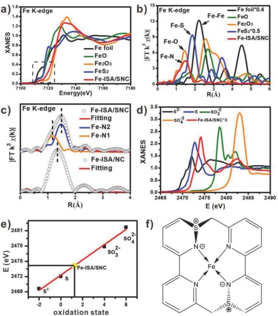 图2 a) Fe K – edge XANES光谱,b) Fe – ISA/SNC的FT – EXAFS曲线(Fe K – edge)。c) Fe – ISA/SNC和Fe – ISA/NC之间的定量EXAFS拟合分析。d) S K – edge XANES光谱和(e) Fe – ISA/SNC和参比材料的线性拟合曲线。f) Fe – ISA/SNC中FeN4S2活性位点的分子结构。
