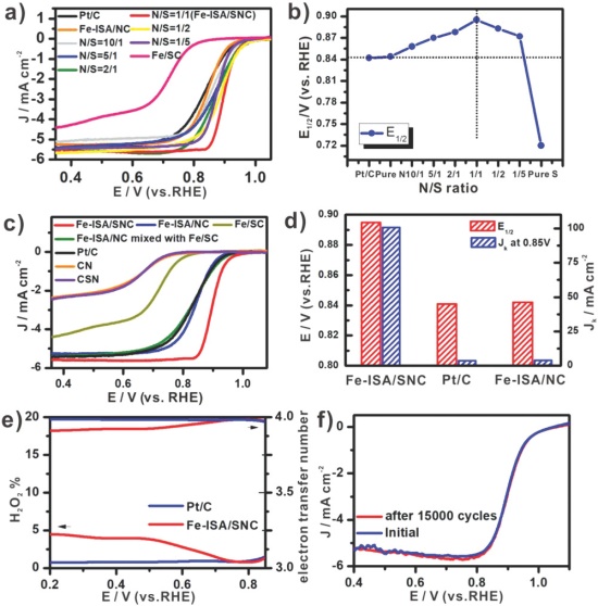 图3a)含不同N/S原子比例的Fe – ISA/SNC样品ORR极化曲线。b) Fe – ISA/SNC材料中N/S比例与相应E1/2的火山型关系曲线。c) 最优Fe – ISA/SNC样品、一系列对照样品以及商业Pt/C的ORR极化曲线。d) Fe – ISA/SNC、Fe – ISA/NC和Pt/C的E1/2以及0.85 V处电流密度Jk的对比图。e) 从0.2到0.85 V Fe – ISA/SNC和Pt/C的H2O2产量和电子转移数 。f) 15,000个周期循环前后的ORR极化曲线。