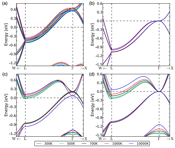 近日,德国埃尔朗根–纽伦堡大学的Andreas Görling教授课题组发现发现闪锌矿半金属的电子相变产生可以仅由于电子温度的变化,而不需要包含结构转变或电子-声子耦合。常用的Kohn-Sham密度泛函方法基于局域和半局域密度泛函使用LDA或GGA方法。然而,由于缺少本征温度依赖性,并考虑到温度仅对能带的占据起作用,会必然导致费米能级的转变,而不发生能带形状或拓扑学变化,常用方法不能描述上述现象。Kohn-Sham方法适用恰当的温度依赖交换势,不受Hartree-Fock交换势的影响,另一方面,可以描述这样的相变。相干效应的简单模型可以通过对交换进行监测。在所研究的闪锌矿化合物中,BDT在低温不稳定,向电子态的转变无QBT发生。Kohn-Sham方法可以假设他们基于比LDA或GGA更准确的泛函,描述这一拓扑相变,此外,电子温度被视为调控拓扑材料的一个切入点。