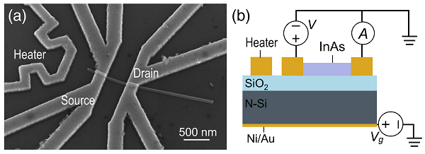 图10 侧边有焦耳热源的InAs纳米线背栅场效应晶体管的形貌,以及装置和电路简图