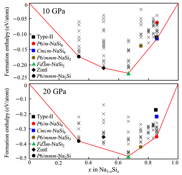 图4:不同组分比的Na1-xSix在10GPa和20GPa下的稳定和亚稳构型的生成焓