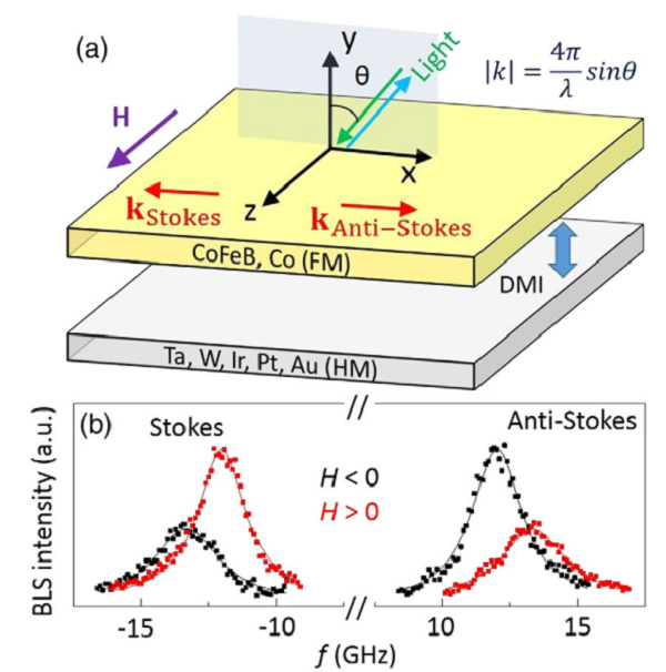 图5:布里渊散射(BLS)技术的测试结构示意图及Damon Eshbach自旋波的BLS谱