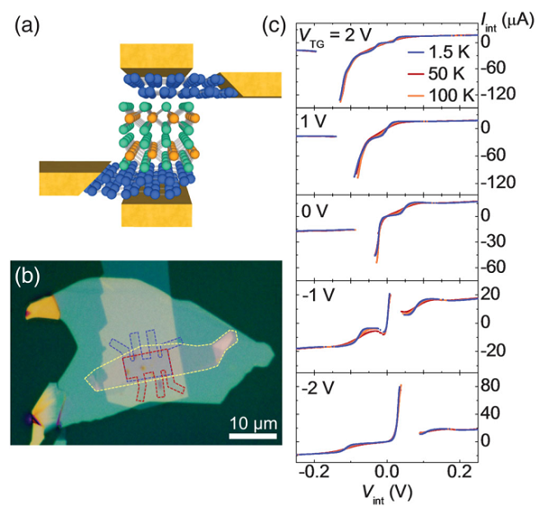 近日,美国德克萨斯大学奥斯汀分校的Emanuel Tutuc教授通过实验观察发现,若石墨烯双分子层之间分布着极性相反、密度相同的载流子,通过WSe2能垒的石墨烯双分子层间的隧道效应会明显增强。这种隧道效应的提高随温度降低在强度上明显增加,温度为1.5K时,隧道电流随层内电压变化而变化,呈垂直开启形式。总体电中性时,明显的增强隧道效应严重偏离单粒子模型计算,二和测得的隧道电流-电压关系很好地匹配,表明在两层间分布的电子和空穴等密度时,会有伴随着凝聚态双分子层间激发的多体态的产生。