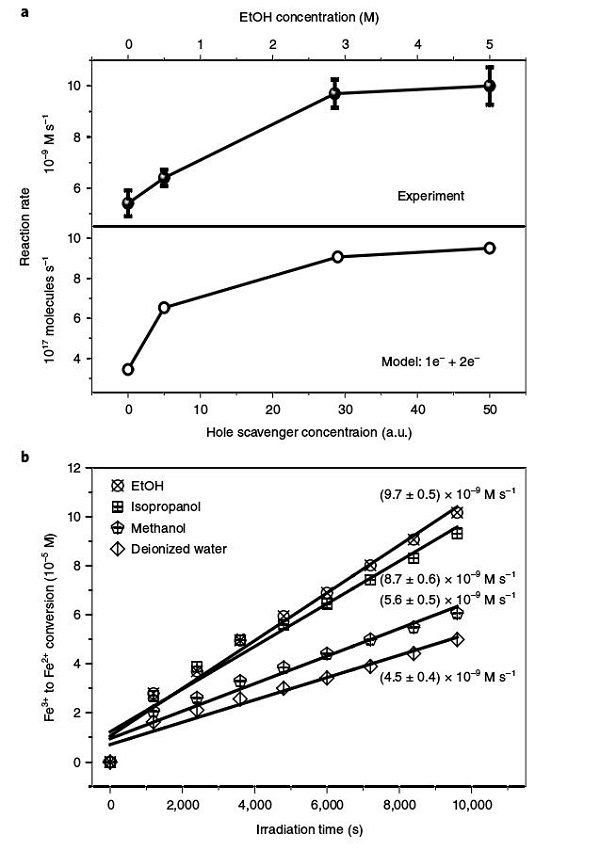 a: 电子转移的实验速率(顶部)随着用作空穴清除剂的浓度的增加而增加,确定速率时的标准拟合误差由每个数据点对应的误差线的大小表示;