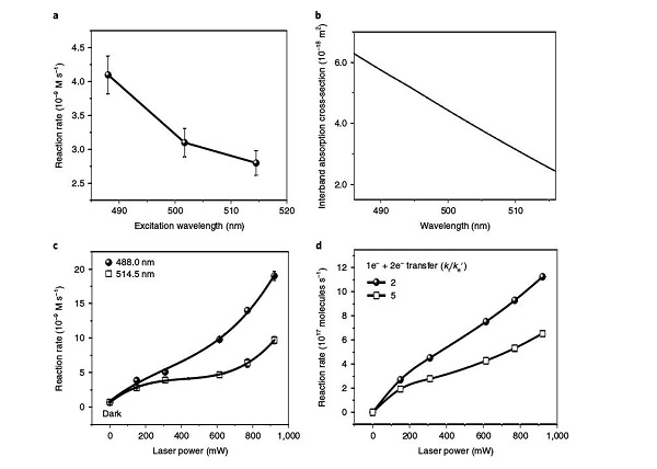 a: 在150mW的激光功率下作为激发波长函数的反应速率曲线显示在较短波长处的反应速率增加,其中频带间吸收更强。确定速率时的标准拟合误差由每个数据点对应的误差条的大小表示;