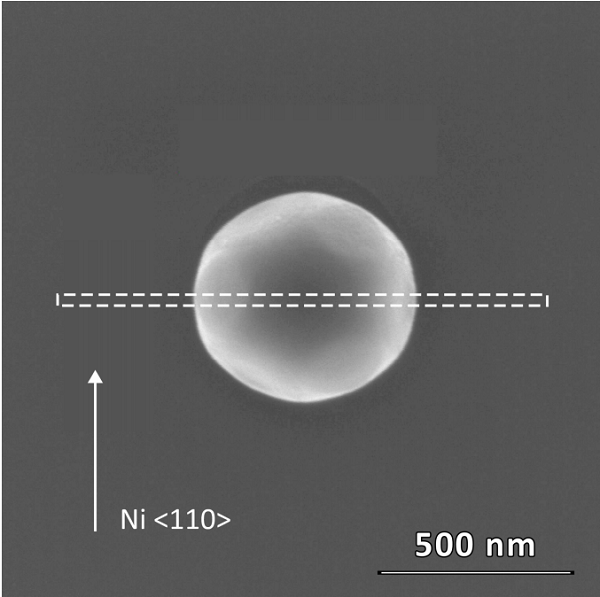 颗粒的(111)面与YSZ基底表面的(111)面平行。点划线矩形为FIB选择的区域,用于TEM分析。