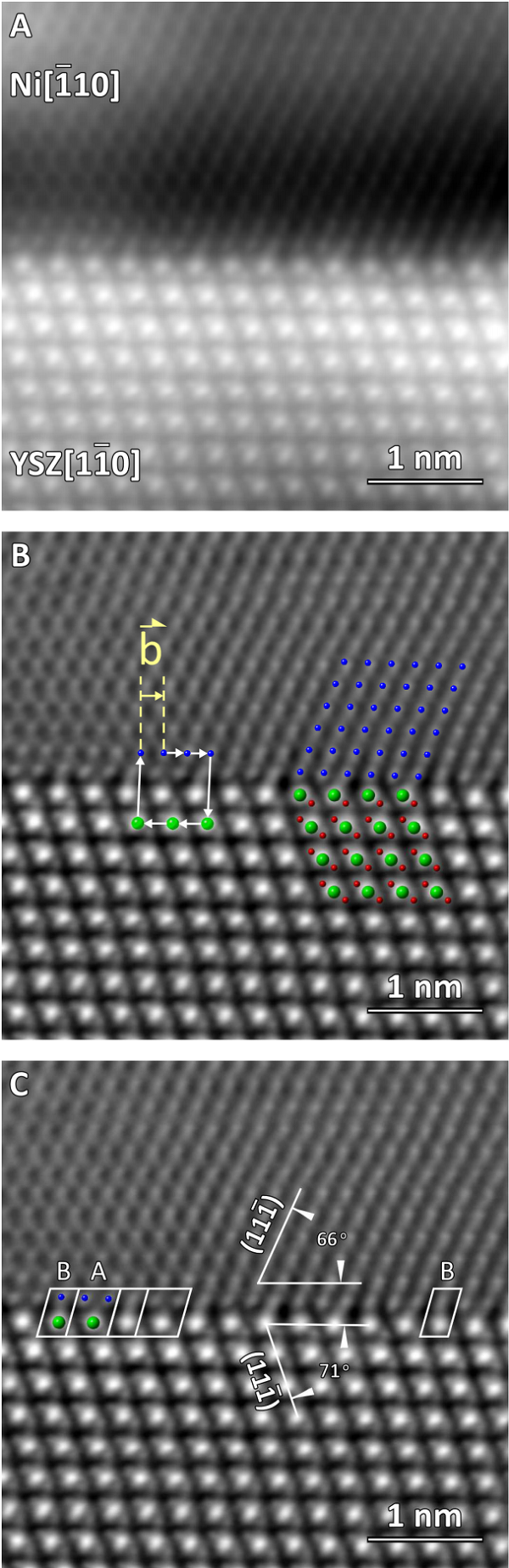 本工作借助IDPC STEM和EDS能谱分布图确定平衡Ni[-110]||YSZ[1-10](111)界面的局域原子结构。实验图像显示界面采用一种含有高密度失配位错的特殊结构,这是由于两相具有特殊的取向关系,产生大的晶格失配导致的。然而,尽管具有较大的晶格失配,界面仍不是非共格的。观察到的位错序列定义了界面的重构结构,通过吸收错配应变能使得界面能最小化。