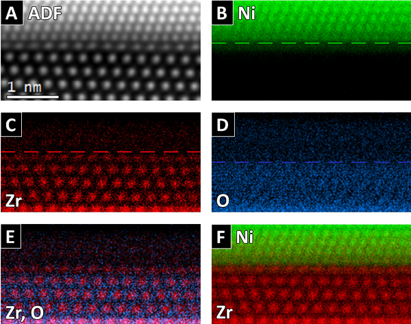 图2:同时获得的平衡态Ni颗粒沿Ni[-110]轴向的界面区域STEM图像。