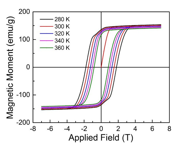 图1:烧结钕铁硼在不同温度 (280、300、320、340和360 K)下的磁滞回线。