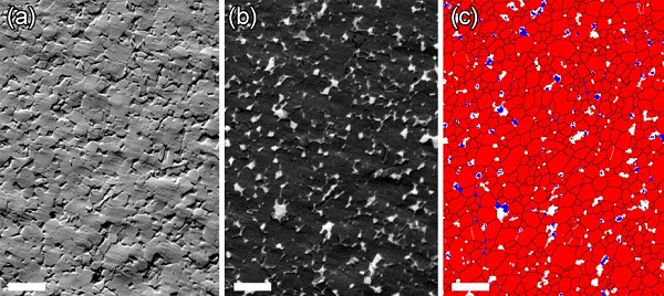 (c) 标定的不同相的相图(2:14:1主相用红色标定,富稀土相用蓝色标定,白色为未标定区域,黑色线条画出了大角晶界)。