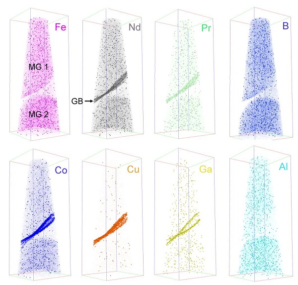 图3:不均匀晶界在原子尺度下的三维原子探针结果,分别显示了铁、钕、镨、硼、钴、铜、镓和铝的在主相晶粒(MG1和MG2)和晶界(GB)下的分布。