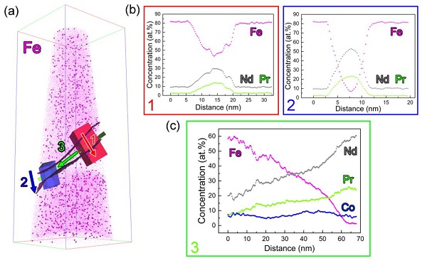 图4:不均匀晶界在原子尺度下的三维原子探针结果的定量分析。发现烧结钕铁硼中的不均匀晶界中铁磁性元素(铁和钴)在70 nm的范围内从67 at.%减少至10 at.%。