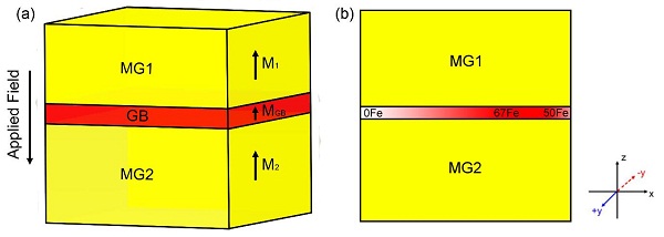 (a) 钕铁硼三明治模型(主相晶粒1—10 nm宽的晶界—主相晶粒2)的示意图,尺寸为 100 nm × 100 nm × 100 nm;