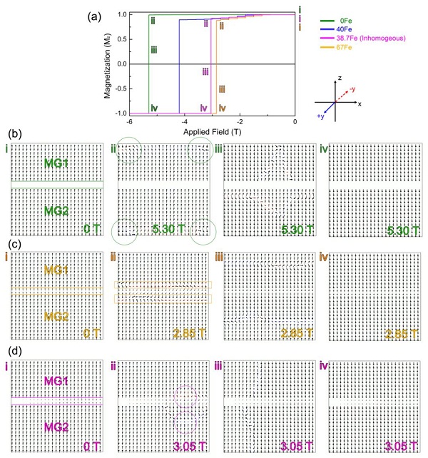 (d) 在退磁情况下,晶界铁磁性元素成分为38.7 at.%(不均匀)的三明治模型的磁矩翻转情况(愿意从铁磁性元素含量较高的晶界区域和主相晶粒的交界面开始形成反向磁畴)。