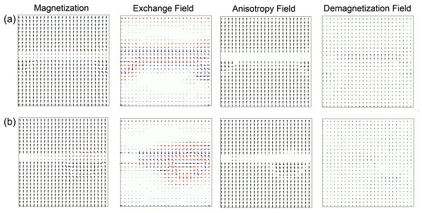 图6:对均匀晶界和不均匀晶界模拟的磁化强度、交换场、磁晶各向异性场、退磁场。发现在退磁过程中,反向磁畴更容易从低磁晶各向异性场、高交换场和高退磁场的区域产生。