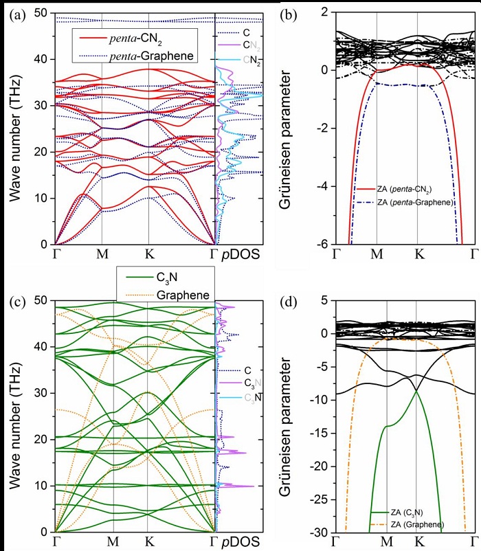 图3 Penta-graphene、penta-CN2、graphene、C3N声子谱及非简谐性分析