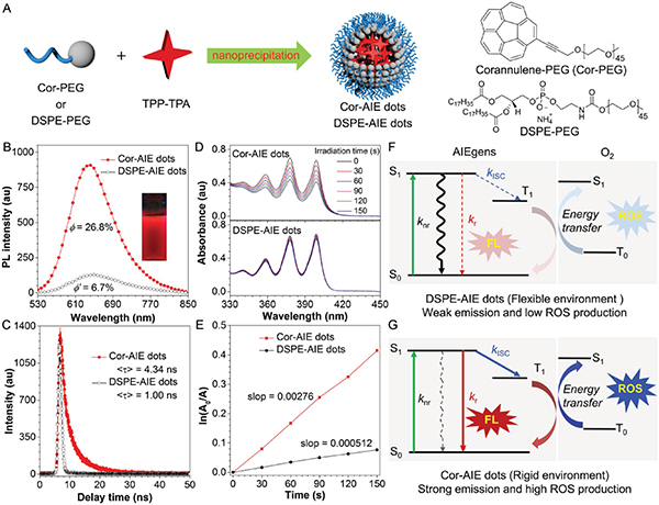 本文首次报道了通过优化荧光纳米粒子间的限域微环境能够开发出具有高效荧光和活性氧产生效率的AIE纳米点。限域微环境进一步限制了AIE分子的分子内旋转,从而抑制了非辐射衰减。在腹膜癌病的小鼠模型实验中,这种AIE纳米点极大地提高了光治疗效果。本文研究结果对其他荧光纳米粒子体系提升癌症光治疗效果具有借鉴意义。