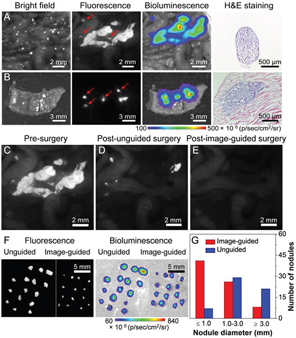 (F) 荧光成像系统和生物发光成像系统检验有无Cor-AIE纳米点荧光引导手术的肿瘤结节;