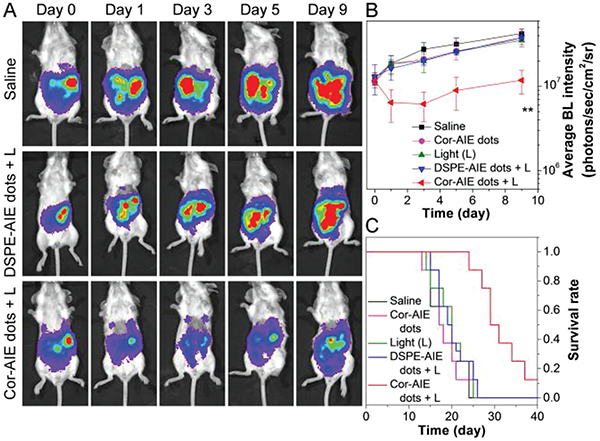(A) 腹膜癌病小鼠在生理盐水、“DSPE-AIE dots + L”和“Cor-AIE dots + L”处理条件下的时间依赖生物发光成像;