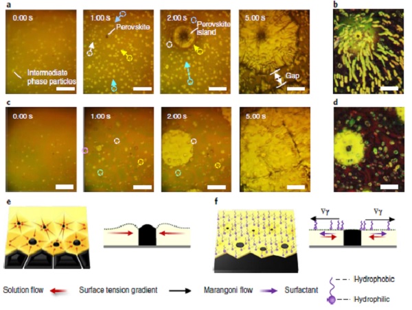 (e). 无表面活性剂钙钛矿油墨干燥过程中钙钛矿岛的微尺度溶液流动示意图;