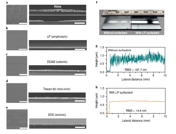 (g, h). 有无表面活性剂的钙钛矿薄膜的表面粗糙度分析。