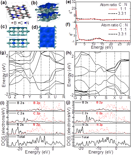 (a – d) 表现出电子不均匀性的h-BCN的电子密度图; (e, f) 分别对应BCN中C和N分别在1 : 1和3.3 : 1原子比例下的介电常数虚部ɛʺ和实部ɛʹ; (g, h) 分别对应C和N原子比例为1 : 1和3.3 : 1的部分能带结构; (i, g) 分别对应C和N原子比例为1 : 1和3.3 : 1的整体态密度分态密度,在B、C、N的分态密度中,实现和虚线分别代表s、p轨道