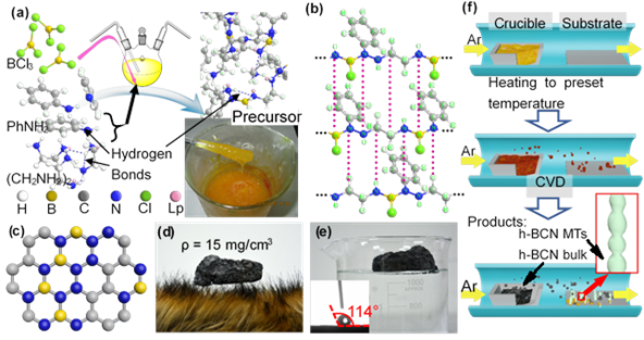 (a) h-BCN先驱体的合成过程; (b, c) 利用有机先驱体合成h-BCN的可能反应路径; (d) 在动物皮毛上的超轻h-BCN块体陶瓷的数码照片; (e) h-BCN浮在水面上的照片和润湿角照片(inset); (f) h-BCN块体和h-BCN微管形成过程及所用装置示意图
