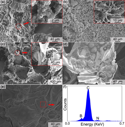 h-BCN块体制备的温度分别为(a) 600 oC,(b) 800 oC,(c, d) 1000 oC,(e) 1200 oC;(f) h-BCN块体的EDS能谱