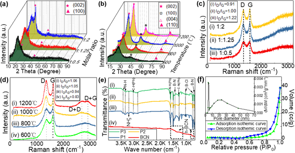 h-BCN样品的 (a, b) XRD图谱和 (c, d)拉曼光谱,其中(a, c)来自不同类型先驱体在500 °C热处理后得到,(b, d)来自P3先驱体在不同热处理温度下热处理后得到; (e) h-BCN块体和不同类型的先驱体的傅里叶红外光谱; (f) h-BCN的N气吸附-脱吸附曲线和孔径分布曲线(内置于f图中)
