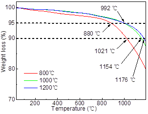 图7 在不同温度制备的h-BCN块体的热稳定:在N2下测得的热重曲线