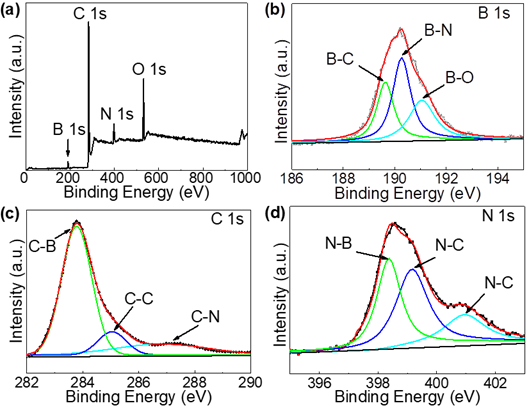 (a) h-BCN的X射线光电子能谱(XPS);(b) – (d) 分别为B、C、N的1s层的XPS能谱;能谱曲线(实点线)通过Gaussian拟合(红色曲线)分峰拟合(彩色实线)