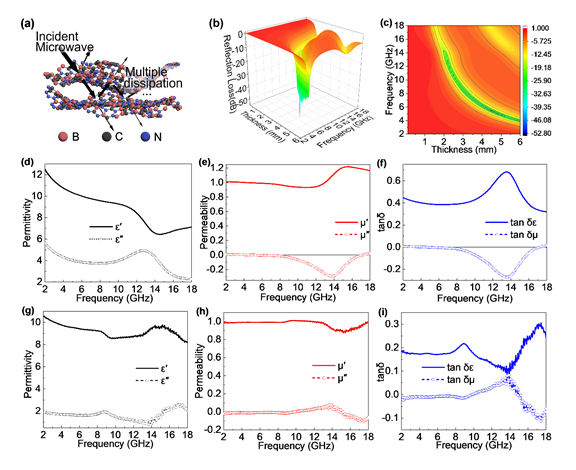 (a) h-BCN网格中可能的电磁波耗散路径的示意图;(b – f)表征用P3先驱体通过H3热处理模式得到的h-BCN块体的相关电磁参数和电磁波吸收特性:(b)具有不同厚度和频率的反射损失值(RL)彩色映射表面图;(c)用来揭示实用时最好性能的等高线图;(d – f)分别为复相对介电常数的频率依赖性,复相对磁导率,介电损耗和磁损耗正切;(g – i)P2型先驱体通过H3热处理模式所得的h-BCN块体的相关电磁参数:(g-i)分别为复数相对介电常数,复相对磁导率,介电损耗和磁损耗正切的频率依赖性。